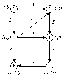 tр(6)= max{tр(2)+t(2,6), tр(5)+t(5,6)}=max{2+3,13+5}=18.