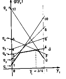 При каждом фиксированном y1 первый игрок, выбравший стратегию δi, несет потери gi (y1). Первый игрок минимизирует свои потери, поэтому мы рассматриваем ломаную (ломаная (рис.1) выделена жирной чертой).