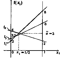 которые имеют следующий смысл: fJ(x1) – это доход фермера, если он использует чистую стратегию Θj, а природа отвечает ему смешанной стратегией x = (x1, 1–x1). Эти линейные функции имеют вид