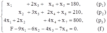 После введения добавочных переменных систему уравнений и линейную функцию записываем в виде расширенной системы:
