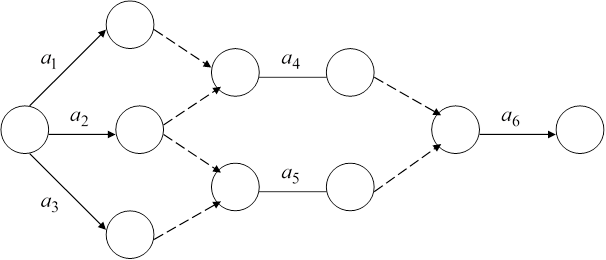 Чтобы отличить операции от связей, операции изображают сплошными линиями, а связи – пунктирами. Вершины графа называют событиями. Временем наступления события считают время, когда завершено выполнение всех операций, входящих в соответствующую вершину.