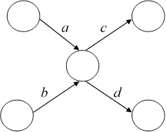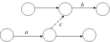 Другой случай – отражение зависимости событий, не связанных реальными работами. Предположим, например, что работы a и b (см. рисунок) могут выполняться независимо друг от друга, но требуют одного и того же оборудования, так что работа в не может начаться, пока не освободится оборудование с окончанием работы a. Это обстоятельство требует введения фиктивной работы c (рис.10.5).