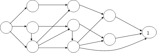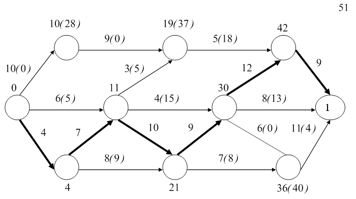 Уже с первого взгляда ясно, что по сравнению с предыдущим графиком упорядоченный график (рис. 10.8) отражает последовательность событий и работ гораздо более чётко и наглядно. В сложных “запутанных” сетях упорядочение графика является первоочередным условием для его последующего анализа. Отметим, что правильно составленный график всегда может быть упорядочен, чего нельзя сказать, например, о графике, содержащим контуры. Методом вычёркивания получаем правильную нумерацию вершин графа. Конечная вершина при этом получает наибольший номер.