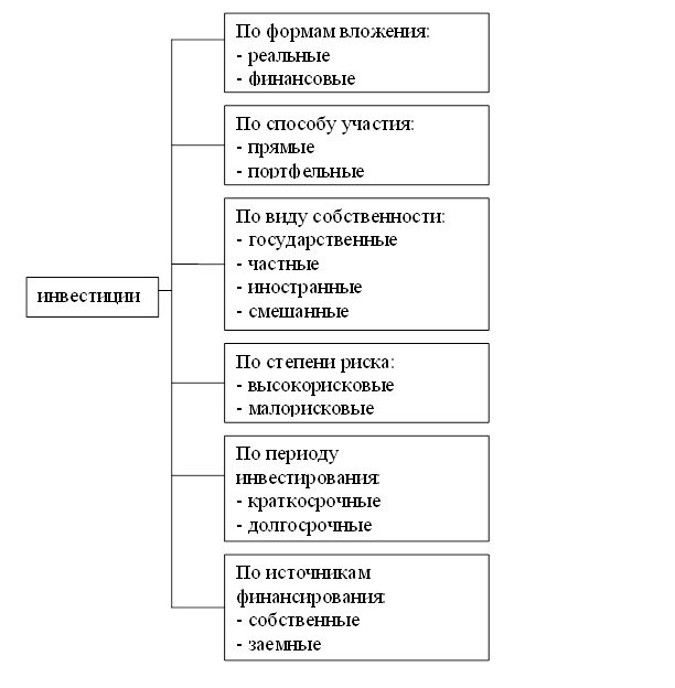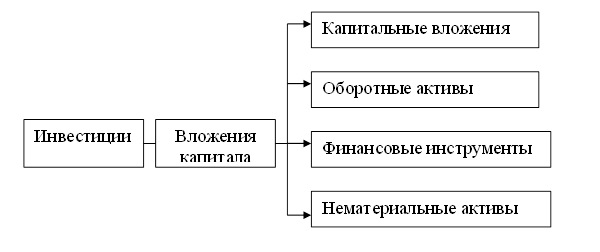 Инвестиции в капитальные вложения представляют собой вложения в новые здания, оборудование, транспорт. Инвестиции в оборотные активы представляют собой вложения в сырье, материалы, полуфабрикаты. Инвестиции в финансовые инструменты представляют сбой вложения в акции, облигации и другие ценные бумаги. Инвестиции в нематериальные активы представляют собой вложения средств в патенты, лицензии, «ноу-хау» и т.п.