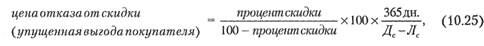 Упущенная выгода (прибыль) продавца составит как минимум сумму банковского процента, которую он мог бы получить через эти 30 дней, если бы положил деньги на депозитный счет в банке. С другой стороны, продавцу часто трудно реализовать свой товар, не предоставив коммерческий кредит покупателю, чтобы сохранить свои позиции на рынке. Если покупатель оплатит товар ранее намеченного срока, то можно воспользоваться скидкой с цены. После этого срока покупатель платит по полной цене (без скидки), но в пределах договорного срока. Что выгоднее покупателю: оплатить товар ранее договорного срока, обратившись для этого в банк за кредитом, или дождаться договорного срока и потерять скидку?