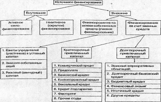 В России источники финансирования предприятий (корпораций) подразделяют на внутренние (собственный капитал) и внешние (заемный и привлеченный капитал с финансового рынка) (рис 4.1)