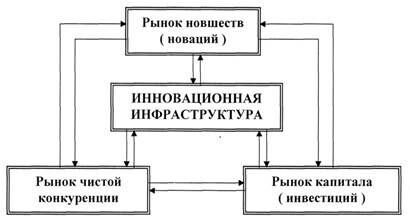 Общеизвестно, что переход от одного качества к другому требует затрат ресурсов (энергии, времени, финансов и тому подобное). Процесс перевода новшества (новации) в нововведение (инновации) также требует затрат различных ресурсов, основными из которых являются инвестиции и время. В условиях рынка как система экономических отношений купли - продажи товаров, основными компонентами инновационной деятельности выступают новшества, инвестиции и нововведения. Новшества формируют рынок новшеств (новаций), инвестиции рынок капитала (инвестиций), нововведения (инновации) рынок чистой конкуренции нововведений. Эти три основных компонента и образуют сферу инновационной деятельности (рис. 1.).