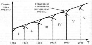 Каждый из укладов в своем развитии проходил различные стадии, отличающиеся мерой его влияния на общий экономический рост в стране. Устаревшие уклады, теряя свое решающее влияние на темпы роста, оставляли в составе национального богатства страны созданные производственные, инфраструктурные объекты, культурное наследие, знания и т. п. Продолжительность некоторых волн больше 50 лет в связи с совпадением периода спада уходящей волны с периодом роста новой волны. В связи с ускорением НТП в будущем продолжительность волн (укладов) будет сокращаться. Схематично эволюцию технологических укладов можно представить в следующем виде (рис. 1).