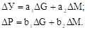 Для примера, в качестве целевых показателей (T1 и T2) можно взять выпуск (Y) и инфляцию (P), в качестве инструментов (I1 и I2) – денежную массу (M) и государственные расходы (G). Коэффициенты a1, a2, b1, b2 в данном случае измеряют количественный эффект влияния G и M на Y и P; их значения определяются типом выбранной макроэкономической модели (например, в кейнсианской модели a1 и a2 могут быть мультипликаторами монетарной и фискальной политики соответственно). Произведя замену переменных в уравнении, мы получим: