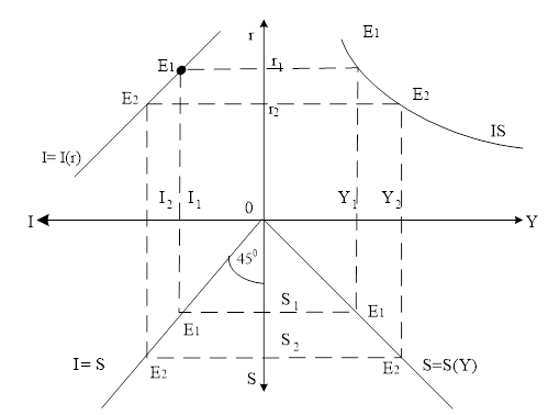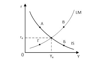 Если мы находимся на кривой IS расположенной ниже точки равновесия E (например, точка Б), то это означает, что на рынке товаров будет существовать равновесие между планируемыми расходами субъектов и произведённым ВНП. А на рынке денег ставка процента окажется слишком низкой, что приводит к превышению спроса на деньги над предложением денег. Как следствие, это приведет к перераспределению денег, направляемых для сделок и для спекуляций, вызовет повышение ставки процента до такого уровня, что возникнет равновесие на рынке денег. Более высокая ставка процента на рынке денег сделает инвестиции менее привлекательными и, как следствие, сократится равновесный объем ВНП на рынке товаров (перемещение по кривой IS) и возникнет равновесие на обоих рынках при меньшем объеме производства и более высокой ставке процента.