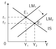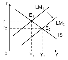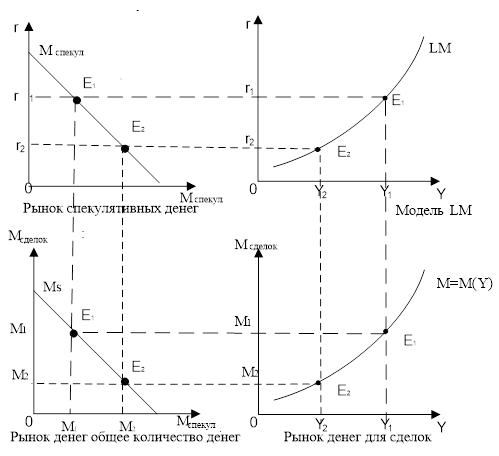 Излишек денег на рынке денег приведёт к падению ставки процента, что приведет к тому, что часть домохозяйств попытается продать свои облигации и увеличит спрос на деньги. Это будет означать перераспределение денег, направляемых для сделок и для спекулятивных целей. Снижение ставки процента на рынке денег позволит больше вкладывать средств в инвестиции, а это содействует дальнейшему увеличению ВНП. Рост объема производства сопровождается ростом доходов и ростом спроса на деньги для сделок, что содействует повышению ставки процента на рынке денег и перераспределению денег между оплатой товаров и сбережениями и процесс перераспределения будет продолжаться до тех пор, пока не возникнет равновесие на рынке денег. Равновесие на рынке денег приведет к тому, что стабилизируется объем инвестиций и тем самым экономика попадёт в ситуацию равновесия, которая характеризуется большим объемом производства при более низкой ставке процента.