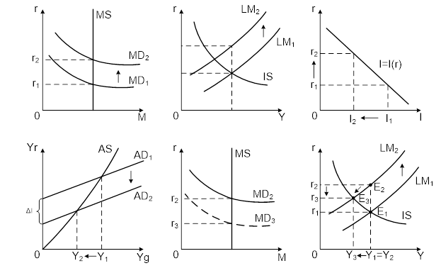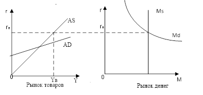В результате этого а) на рынке денег возрастает спрос на деньги для спекуляции, так как становится более выгодным хранить сбережения в форме ценных бумаг; б) на рынке товаров происходит падение объема инвестиций, так как инвестиции становятся менее выгодными из-за высокой ставки процента, что вызывает уменьшение совокупного спроса. Это значит, что совокупное предложение становится больше чем совокупный спрос на товары и услуги, растут незапланированные запасы нереализованной продукции. Это заставит предпринимателей уменьшить объем производства и совокупное предложение. Уменьшение объема производства вызовет уменьшение доходов и сокращение спроса на деньги для сделок, что приводит к падению общего спроса на деньги и перераспределению объема денег, направляемых для сделок и для спекуляций таким образом, что на рынке денег установится равновесие. Одновременно на рынке товаров прекратится падение производства и сформируется новое равновесие. Общим итогом изменений в экономике под воздействием роста спроса на деньги будет повышение равновесной ставки процента при меньшем объеме ВНП.