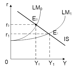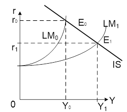 При большей чувствительности спроса к ставке процента (f) требуется меньшее повышение процентной ставки для возвращения рынка в равновесие. Итак, чем больше чувствительность спроса на деньги к процентной ставке, тем более пологой будет кривая LM. Это означает, что равновесие на рынке денег достигается при очень небольшом снижении ставки процента в ответ на рост денежной массы.