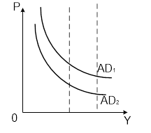При росте государственных расходов или сокращении налогов кривая IS смещается вправо до положения IS1, что отражает рост совокупного спроса до состояния AD2. Сдвиг кривой совокупного спроса вызывает инфляцию спроса и уровень цен возрастает до Р1, так как в силу инерционности производства растущий спрос мгновенно полностью не может быть удовлетворен. Рост цен означает сокращение реальных кассовых остатков (М/Р) и сокращение предложения денег в стране. В результате этого кривая LM сдвигается вверх до положения LM1. В точке В формируется краткосрочное равновесие на обоих рынках.