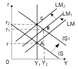 В данной ситуации эффективность кредитно-денежной политики будет наивысшей, так как предложение денег оказывает сильное воздействие на ставку процента и рост объема производства. Эту ситуацию часто называют грубой формой монетаризма, так как представители данного направления экономической мысли подчеркивают важность номинального предложения денег для стимулирования совокупного спроса и роста объема производства. Одновременно монетаристы считают, что в случае вертикальной LM изменение фискальной политики не влияет на совокупный спрос и объем производства.