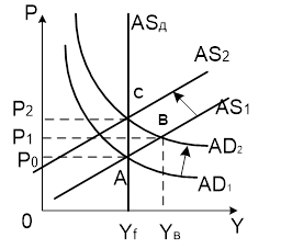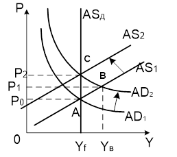 В дальнейшем инфляция издержек приводит к сокращению совокупного предложения и росту цен до уровня Р2. Рост цен еще в большей степени сокращает реальные кассовые остатки и сдвигает кривую LM до первоначального уровня. В точке А в рамках модели IS–LM вновь сформируется долгосрочное равновесие. На графике модели AD–AS равновесие будет описываться точкой С, характеризующей экономику ситуацией полной занятости, объемом производства соответствующим потенциальному при более высоком уровне цен.