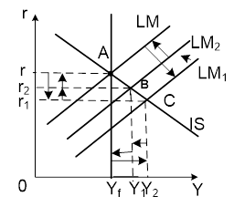 В этой ситуации предприниматели начнут сокращать объём производства, что приведёт к падению объема инвестиций и объёма производства. Упадут доходы субъектов хозяйственной деятельности, как следствие, упадет спрос на деньги для сделок, и это приведет к падению ставки процента, перераспределению денежной массы и формированию нового равновесия на рынке денег при более низкой ставке процента (перемещение по кривой LM из точки В в точку Е).