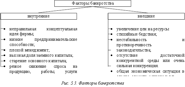 Факторы, вызвавшие банкротство предприятия, можно рассматривать как внутренние, так и внешние (рис. 5.3).