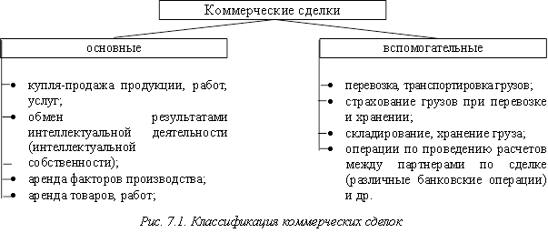 Видов коммерческих сделок много; их можно разными способами классифицировать. Один из видов классификации можно представить следующим образом (рис. 7.1).