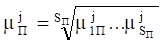 4) характеристики, так же как и в способе 1 оценки конкурентоспособности, разбить на потребительские и экономические. Для каждой из групп найти агрегирующую функцию μПj и μэкj, которые предлагается рассчитывать как среднее геометрическое значений функции принадлежности по отдельным признакам, то есть: