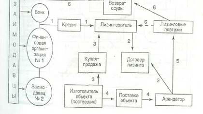 2.2. Финансовый лизинг — наиболее распространенный вид лизинга, предусматривающий сдачу в аренду техники на длительный сроки полное или почти полное возмещение ее стоимости за период использования. По сути дела он представляет собой форму долгосрочного кредита в виде функционирующего капитала. По окончании срока действия договора лизинга пользователь может приобрести имущество в собственность, возобновить соглашение на льготных условиях или прекратить отношения. Финансовый лизинг отличается тем, что не предусматривает сервисного обслуживания имущества арендодателем, не допускает досрочного прекращения договора. Реализация его предусматривает отбор потенциальным арендатором необходимой техники, переговоры с изготовителем оценен сроках поставки, покупку оборудования лизинговой компанией и получение ссуды банка (схема 6).
