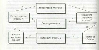 Транзитный (косвенный) международный лизинг имеет место в тех случаях, когда лизингодатель одной страны берет кредит или приобретает необходимое оборудование в другой стране и поставляет его арендатору, находящемуся в третьей стране (схема 10).