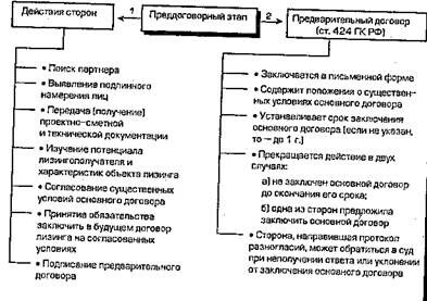 На начальном преддоговорном этапе заинтересованные в лизинге стороны занимаются поиском подходящего партнера, проведением .рекламных и других действий'(схема 30).