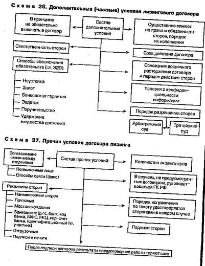 Дополнительные условия определяют отдельные, частные вопросы лизинговых отношений, вытекающие из специфики вида лизинга или действующих законов и иных нормативных актов (схема 36). Прочие условия приобретают юридическую силу только при включении их в договор (схема 37).