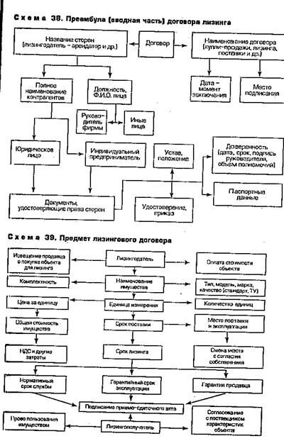 В зависимости от вида лизинга, субъектов сделки и других особенностей содержание конкретного лизингового договора может варьировать и детализироваться в разной степени. Но наиболее важные параметры имеют место во всех лизинговых контрактах (схемы 38, 39).