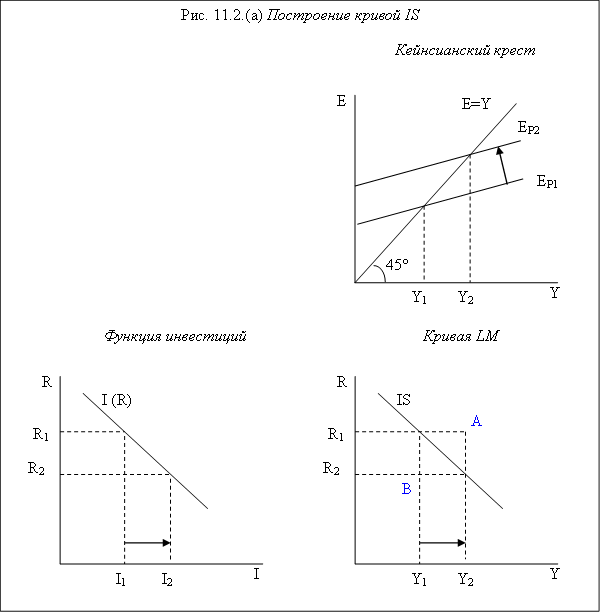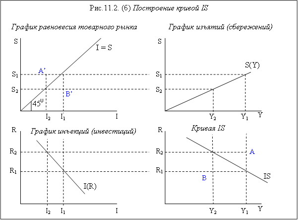 На рис.11.2.(б) кривая IS выводится из принципа равенства инъекций (инвестиций) и изъятий (сбережений) (что является условием равновесия товарного рынка), который следует из основного макроэкономического тождества:
