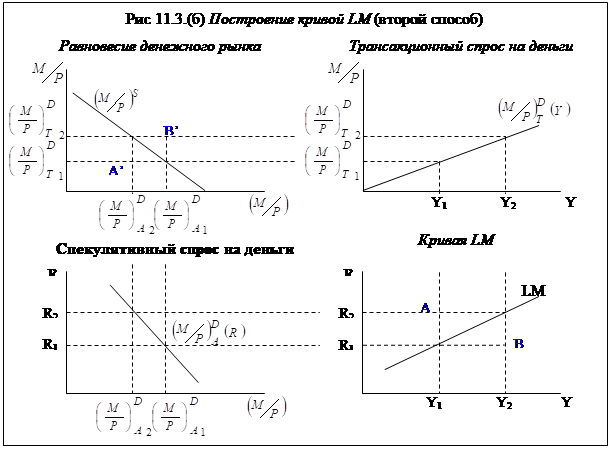 На рис.11.3.(a) кривая LM строится на основе графика равновесия денежного рынка (выводимого из кейнсианской теории предпочтения ликвидности). Рост уровня дохода (от Y1 до Y2) увеличивает спрос на деньги, смещая кривую МD вправо, что увеличивает ставку процента от R1 до R2. Это позволяет построить кривую LM, показывающую, что для обеспечения равновесия денежного рынка более высокому уровню дохода будет соответствовать более высокая ставка процента. Поэтому наклон кривой LM положительный.