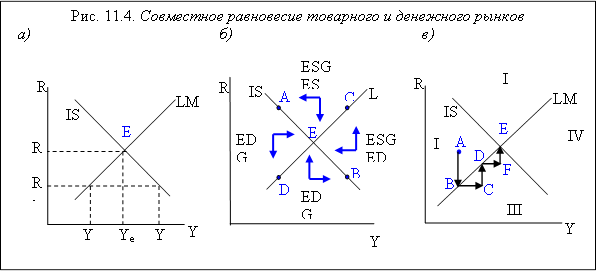Ни кривая IS, ни кривая LM не определяют сами по себе величину равновесного дохода Yе и равновесной ставки процента Rе. Равновесие в экономике определяется совместно кривыми IS и LM в точке их пересечения (рис.11.4.(а)).