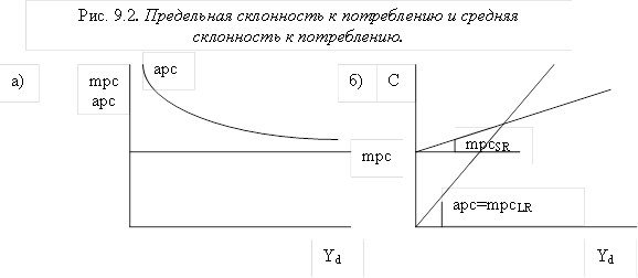 - растет. Долю потребления в доходе (т.е. отношение величины потребления к величине дохода) Кейнс назвал средней склонностью к потреблению (average propensity to consume – apc), а долю сбережений в доходе (т.е. отношение величины сбережений к величине дохода) – средней склонностью к сбережению (average propensity to save – aps):