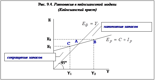 Равновесие расходов и дохода, т.е. равновесие товарного рынка находится в точке пересечения двух кривых (т. А). В этой точке: 1) планируемые расходы равны выпуску (доходу): Е р = Y; 2) фактические расходы равны планируемым расходам: Е = Е р; 3) инъекции равны изъятиям: I = S; 4) планируемые инвестиции равны сбережениям: I р = S