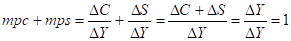 Сумма предельной склонности к потреблению и предельной склонности к сбережению равна 1: