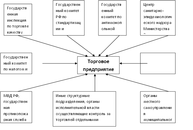 Основной контроль за предприятиями осуществляет государственная инспекция по торговле ( независимо от форм собственности и ведомственной принадлежности торгового предприятия). За нарушения правил в сфере торговли предприятия привлекаются к административной и гражданской ответственности. Должностные лица и сотрудники – к административной, гражданской и уголовной, а также дисциплинарной и материальной ответственности.