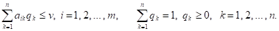 Аналогичным образом заключаем, что оптимальная смешанная стратегия Q = {q1, q2, … , qn} игрока В при любой чистой Стратегии А1 игрока A, i = 1, 2,... , m, обеспечивает его средний проигрыш, не больший v. Иными словами, выполняются соотношения