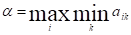 Пояснение. Действуя наиболее осторожно и рассчитывая на наиболее разумное поведение противника, игрок А должен остановиться на той стратегии Ai, для которой число аi, является максимальным.