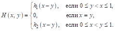 Будем считать, что если игрок А добился превосходства на одном из рынков (на другом превосходства автоматически добивается игрок В), то он вытесняет про­тивника с этого рынка и получает выигрыш, пропорциональный избытку вложенных средств с коэффициентом, характеризующим важность рынка (этот коэффициент ра­вен k1 для первого рынкам k2 Для второго). Тогда функция выигрыша H (x, у) игрока А определяется формулой