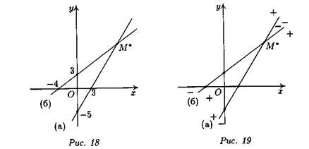 Прямая, заданная уравнением (а), разбивает плоскость, и начальная точка О (0,0) лежит в положительной полуплоскости. В рассматриваемом случае то же справедливо и для прямой, заданной уравнением (б) (рис. 19).