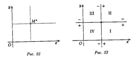 Начало координат О(0,0) лежит в положительной полуплоскости относительно горизонтальной прямой, задаваемой уравнением (3), а относительно вертикальной прямой, задаваемой уравнением (4), — в отрицательной полуплоскости (рис. 23).