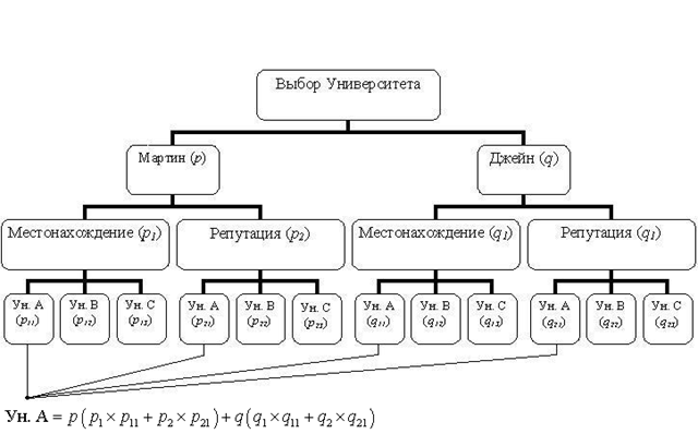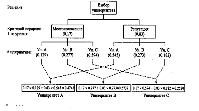 Структура задачи принятия решений приведена на рис. 14.1. Задача имеет единственный иерархический уровень с двумя критериями (местонахождение и репутация) и три альтернативных решения (университеты А, В и С).