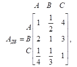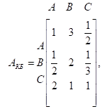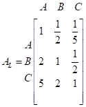 Относительные веса альтернативных решений, соответствующих университетам А, В и С, вычисляются в пределах каждого критерия R и L с использованием следующих двух матриц сравнения.