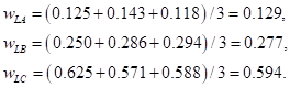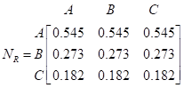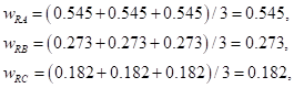 Величины (wra, wrb, wrc) = (0.545, 0.273, 0.182) дают соответствующие веса для университетов А, В и С с точки зрения академической репутации. Аналогично величины (wia, wlb, wlc) = (0.129, 0.277, 0.594) являются относительными весами, касающимися местонахождения университетов.