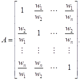 , именуемую матрицей парных сравнений, которая отражает суждение лица, принимающего решения, относительно важности различных критериев. Парное сравнение выполняется таким образом, что критерий в строке i (i = 1, 2, …, n) оценивается относительно каждого из критериев, представленных n столбцами. Обозначим через aij = 1 элемент матрицы А, находящийся на пересечении i-й строки и j-го столбца. В соответствии с методом анализа иерархий для описания упомянутых оценок используются целые числа от 1 до 9. При этом aij = 1 означает, что i-й и j-й критерии одинаково важны, aij = 5 отражает мнение, что i-й критерий значительно важнее j-го, а aij = 9 указывает, что i-й критерий чрезвычайно важнее j-го. Другие промежуточные значения между 1 и 9 интерпретируются аналогично. Согласованность таких обозначений обеспечивается следующим условием: если aij = k, то автоматически = 1/k. Кроме того, все диагональные элементы aii матрицы А должны быть равны 1, так как они выражают оценку критерия относительно самих себя.