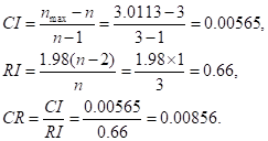 Коэффициент согласованности CR используется для проверки согласованности матрицы сравнения А следующим образом. Если CR < 0.1, уровень несогласованности является приемлемым. В противном случае уровень несогласованности матрицы сравнения А является высоким и лицу, принимающему решение, рекомендуется проверить элементы парного сравнения aij матрицы А в целях получения более согласованной матрицы.
