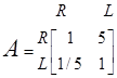 Покажем как определяется матрица сравнения А для задачи выбора Мартина из примера 3.2.–1. Начнем с главного иерархического уровня, который имеет дело с критериями академической репутации и его местонахождения. С точки зрения Мартина академическая репутация университета значительно важнее его местонахождения. Следовательно, он приписывает элементу (1,2) матрицы А значение 5, т.е. a12=5. это автоматически предполагает, что a21=1/5/ обозначив через R и L критерии репутации университета и его местонахождения, можно записать матрицу сравнения следующим образом.