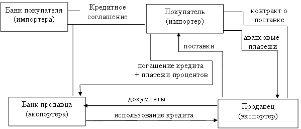 Особенность кредита покупателю заключается в том, что банк экспортера непосредственно кредитует не национального экспортера, а иностранного покупателя, т. е. фирмы страны-импортера и их банки.