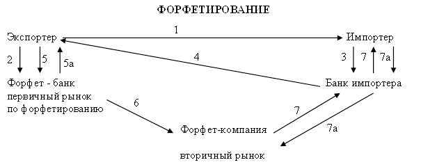 В банковской практике это покупка на полный срок на заранее установленных условиях векселей, других долговых обязательств. Покупатель требований берет на себя коммерческие риски без права регресса (оборота) этих документов на экспортера.
