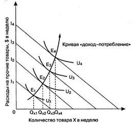 Смещение бюджетной линии приводит к новой точке равновесия, поскольку при каждом уровне дохода потребитель выбирает наиболее полезный набор благ. Связывая все точки равновесия на карте кривых безразличия, соответствующие различным величинам дохода, мы получаем кривую "доход-потребление", которая показывает, как потребительский набор изменяется в зависимости от дохода.